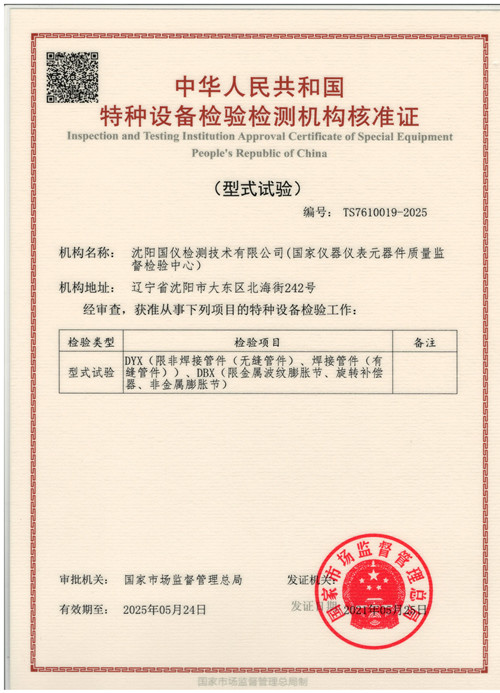 經(jīng)國家市場監(jiān)督管理總局審查,獲準從事DYX(限非焊接管件(無縫管件)、焊接管件(有縫管件))、DBX(限金屬波紋膨脹節(jié)、旋轉(zhuǎn)補償器、非金屬膨脹節(jié))特種設備型式試驗檢驗工作。